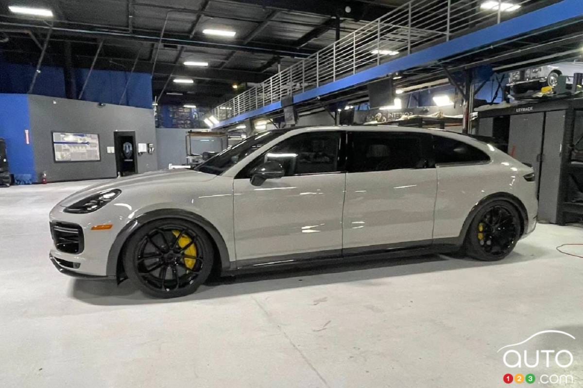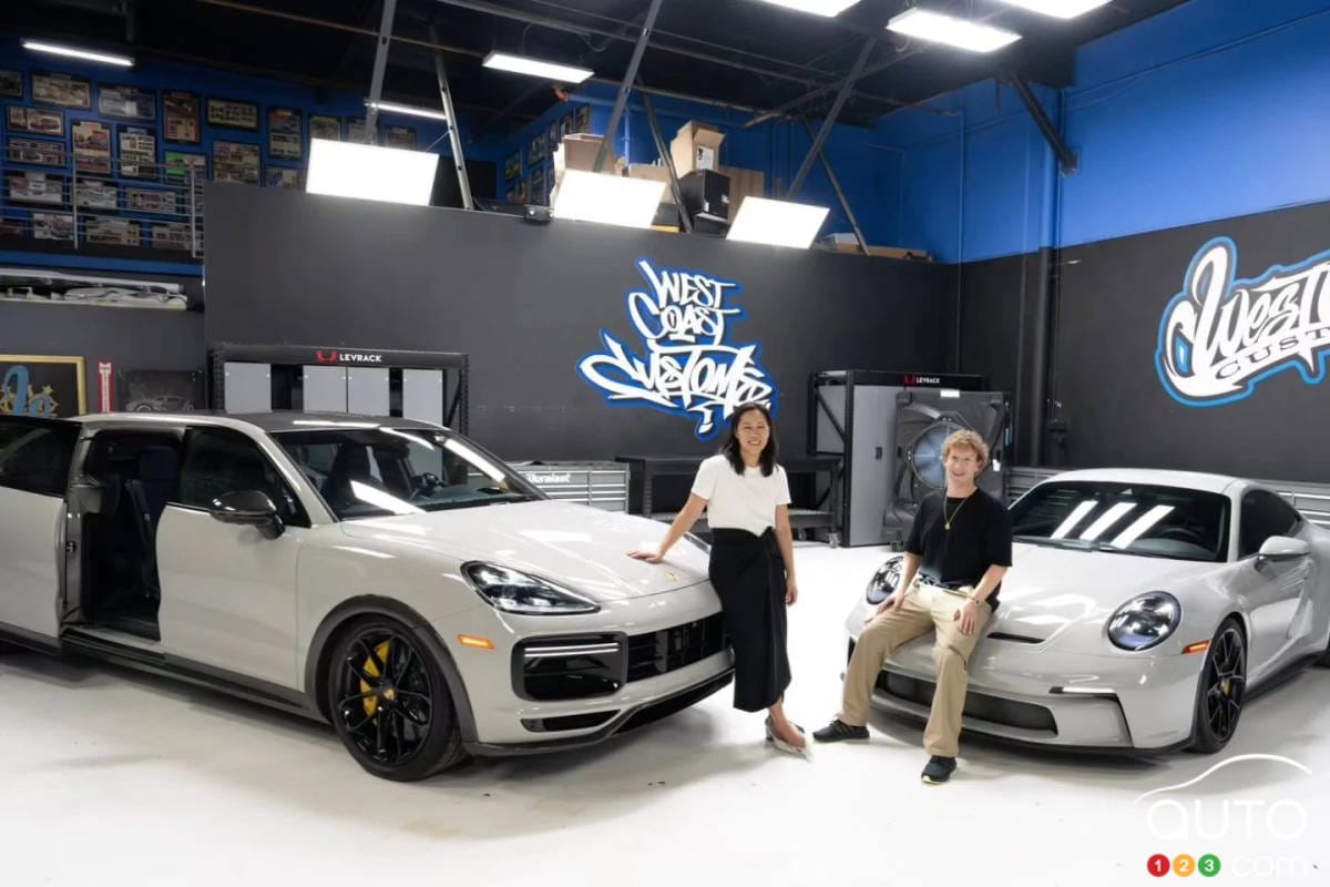 Mark’s wife Priscilla wanted a family car but I suspect he didn’t want to get a van so he had West Coast Customs extend a Porsche Cayenne, equip it with sliding van doors, and then just for fun, get his own matching Porsche GT3 Touring.