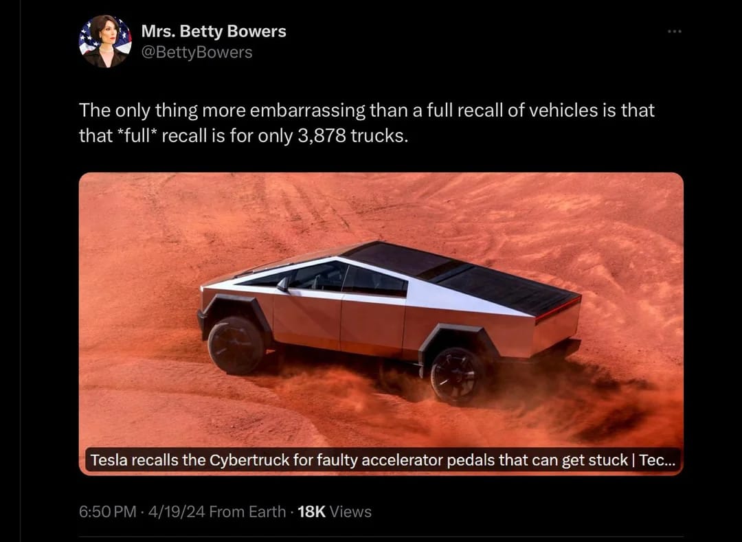 This week Tesla issued a recall for faulty metal oxide semiconductor field effect transistors or MOSFET…say that 5 times fast…bringing the grand total of recalls for someone who received a Cybertruck basically when they first came out to 6.